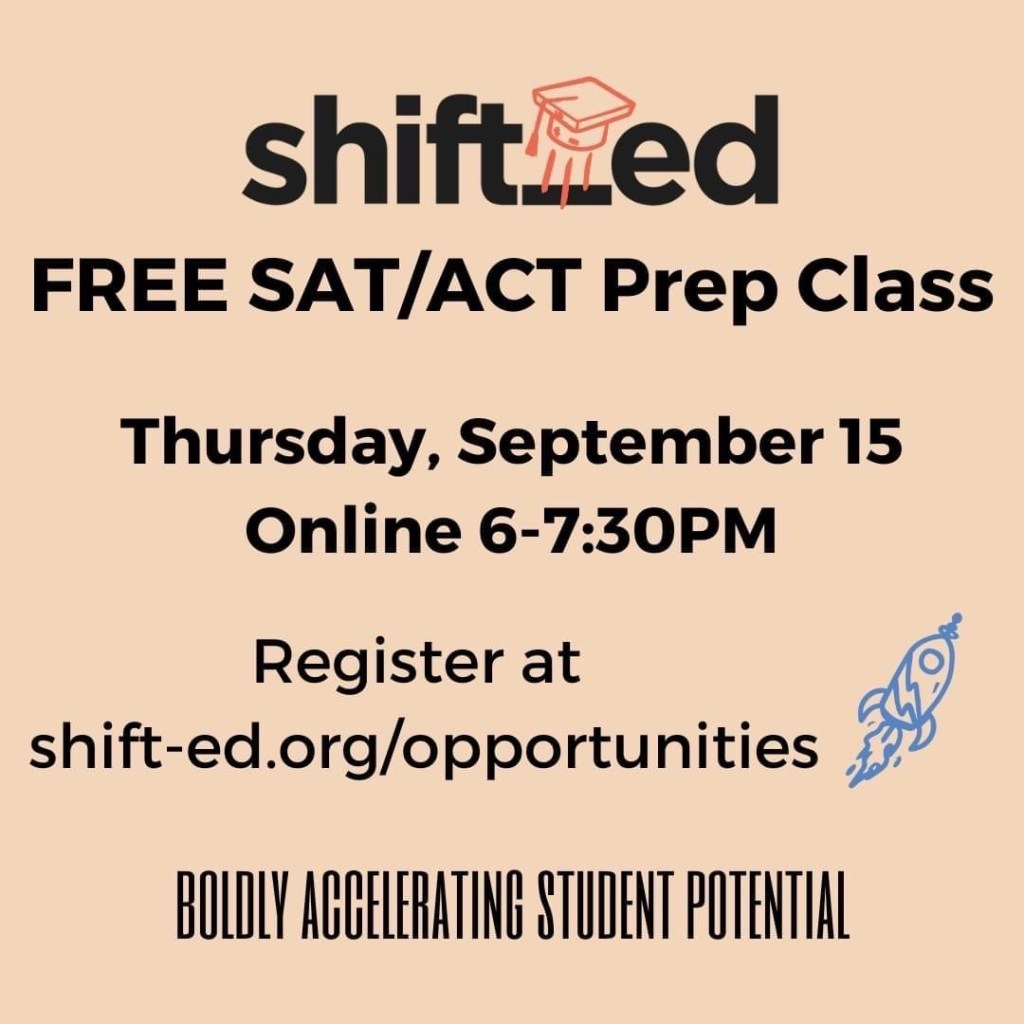 This Thursday!!! Shift_ed is offering a virtual SAT/ACT Prep Class, coming up from 6-7:30pm on Thursday, Sept. 15. Register here: http://ow.ly/MS8650KyZM1