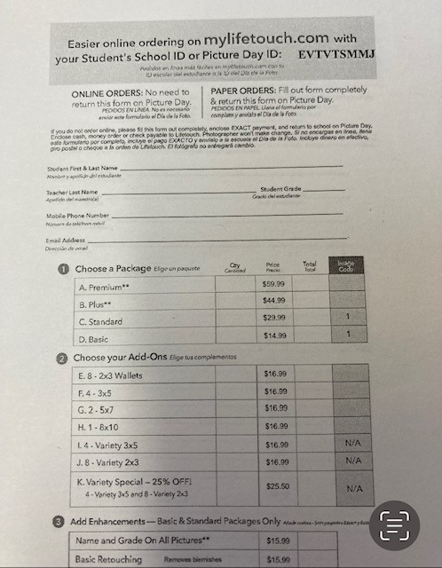 Parents can order underclassmen pictures online using the code on top right of the form above or bring Jamie Johnson the completed packet with the exact money, and Ms. Johnson can mail it in.