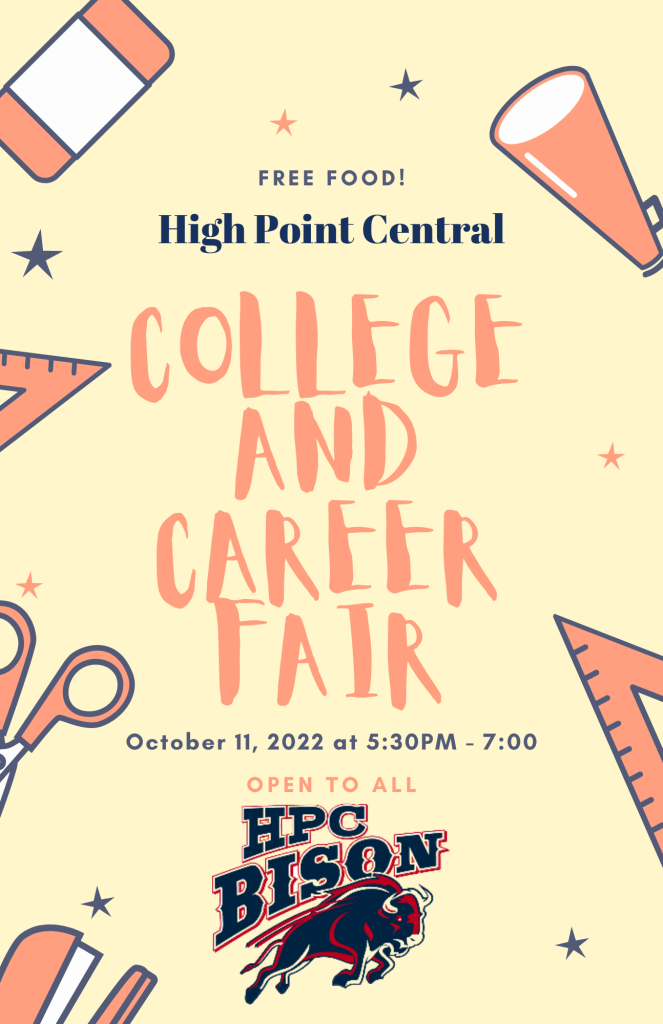 Please join us for our Career and College fair this Tuesday from 5:30-7 in the cafeteria. There will be are over 35 representatives on site. This is perfect timing with the following week of October 17th-21st with CFNC’s FREE College Application Week. College representatives from around NC, career professionals, local organizations and businesses will join us on Tuesday to allow our students time to explore their college and career options. We are strongly encouraging our Juniors and Seniors to be present. There will be free food will be provided as long as it lasts!