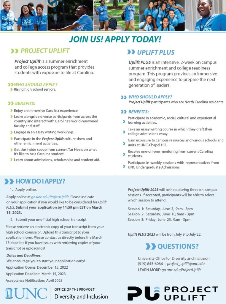 Firstly, Project Uplift is “a summer enrichment and college access program that provides students with exposure to life at Carolina.” This is open to all NC residents because it is a great way for them to get exposure to college life. The deadline is March 15th Students can apply here: https://diversity.unc.edu/project-uplift-and-uplift-plus/