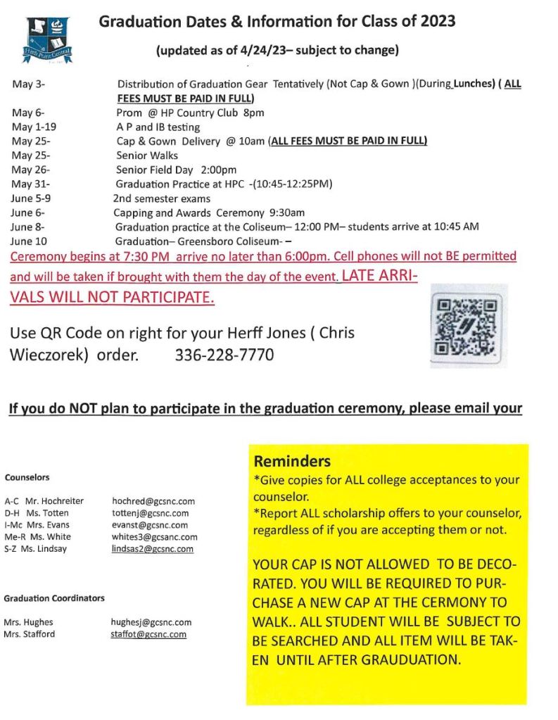 7:30PM Graduation – Greensboro Coliseum – Arrive no later than 6PM in order to walk – no cell phones