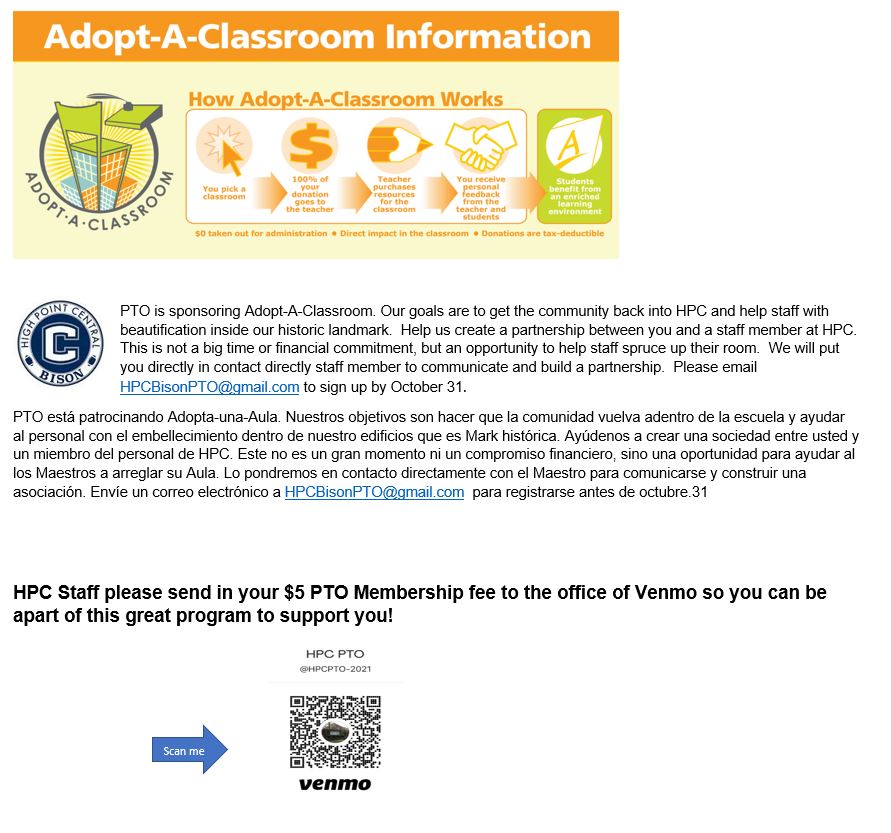 We are also still in need of volunteers for our Adopt-A-Room. Help us create a partnership between you and a staff member at HPC. This is not a huge time or financial commitment, but an opportunity to help staff spruce up their room. We will put you directly in contact with a staff member to communicate and build a partnership. Are you not too sure how you can help? We have had a great turnout so far, but we need more volunteers! Simply e-mail our PTO president at cecewas@aol.com.