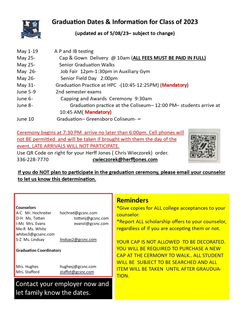 7:30PM Graduation – Greensboro Coliseum – Arrive no later than 6PM in order to walk – no cell phones