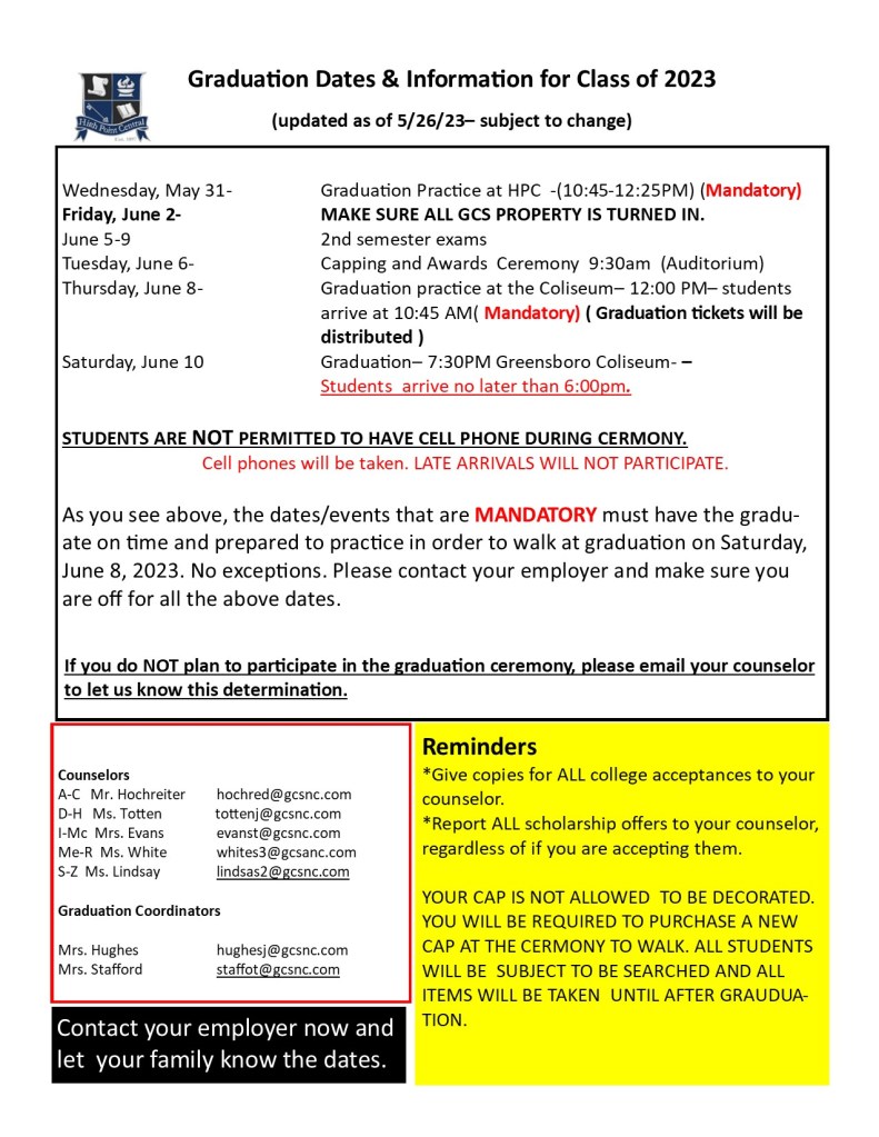 Noon – Graduation Practice – Greensboro Coliseum – Must be present in order to walk at Graduation. Must be at the coliseum by 10:45 in the downstairs lobby. Graduation Ticket will be distributed at this practice.