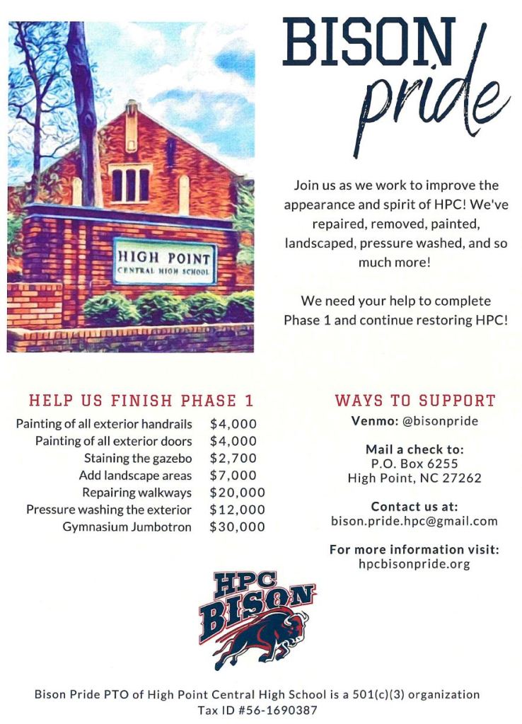 Two weeks from tomorrow, we start school! As a gentle reminder, and for those of you who are new to High Point Central, you will receive a weekly blog every Sunday night at 6:30 PM, followed by a 7:00PM translated version in Spanish. We will also send the links to this message in text and E-mail. If you do not receive those links, please e-mail our Data Manager, Tracy Hamlin, at hamlint@gcsnc.com. If you happen to delete any of your blogs received and want to review them, you can go to the High Point Central website and find the icon in the middle of the homepage that says Principal’s Bison Bulletin. We will send occasional messages during the week, and of course, if your student is absent one or more blocks In a day, you will be notified as well.