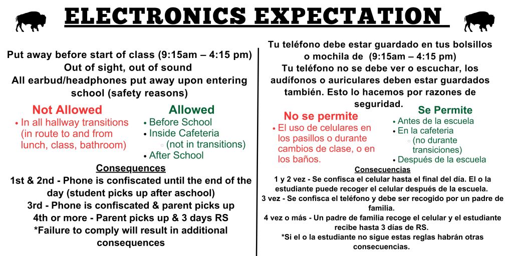 Please review this policy with your students. We are a 1:1 district,. therefore, there is no need for electronics to be out.