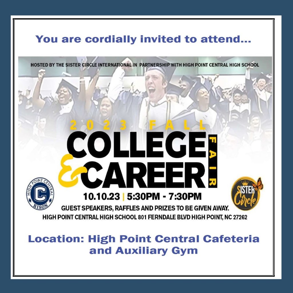 All students & parents are invited to attend the 2023 Fall College and Career & Industry Fair that will be held on Tuesday, October 10th from 5:30 – 7:30 in partnership with Sister Circle in both the Aux Gym and Cafe’. Students, you have a fantastic opportunity to engage with College/University Admissions Representatives regarding academics, the admissions process, honors college, financial aid/scholarships, and campus life. Likewise, explore the different career opportunities from Industry Representatives and Military Recruiters.