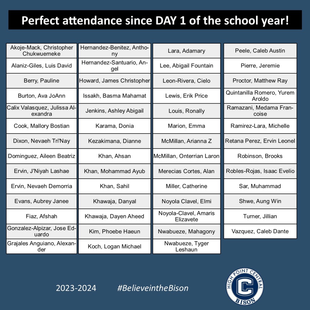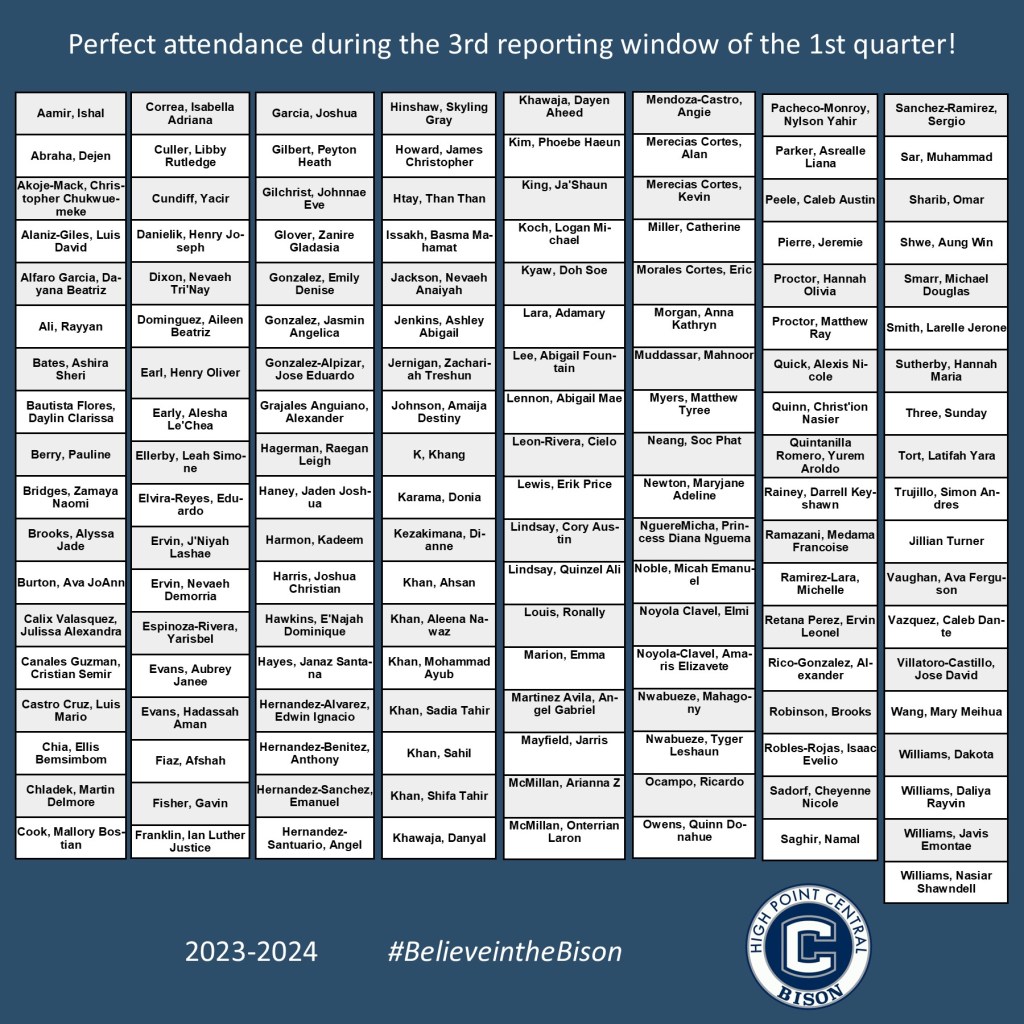 Congratulations to students who had perfect attendance during the 3rd reporting window of the 1st quarter!