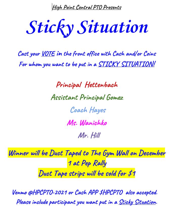 The PTO is holding a “Sticky Situation” fundraiser. Would you like a staff member stuck to the wall by duct tape? Here’s your chance to donate towards that staff member. There’s not much time left!