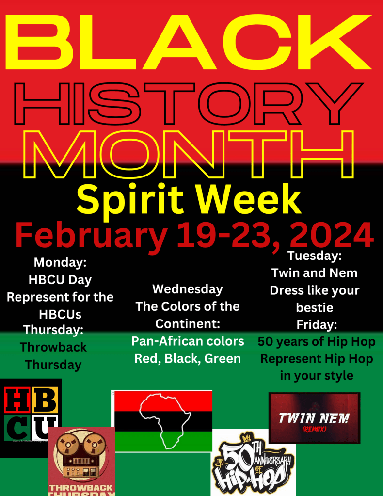 A week from Monday, we celebrate Black History Month with spirit week!