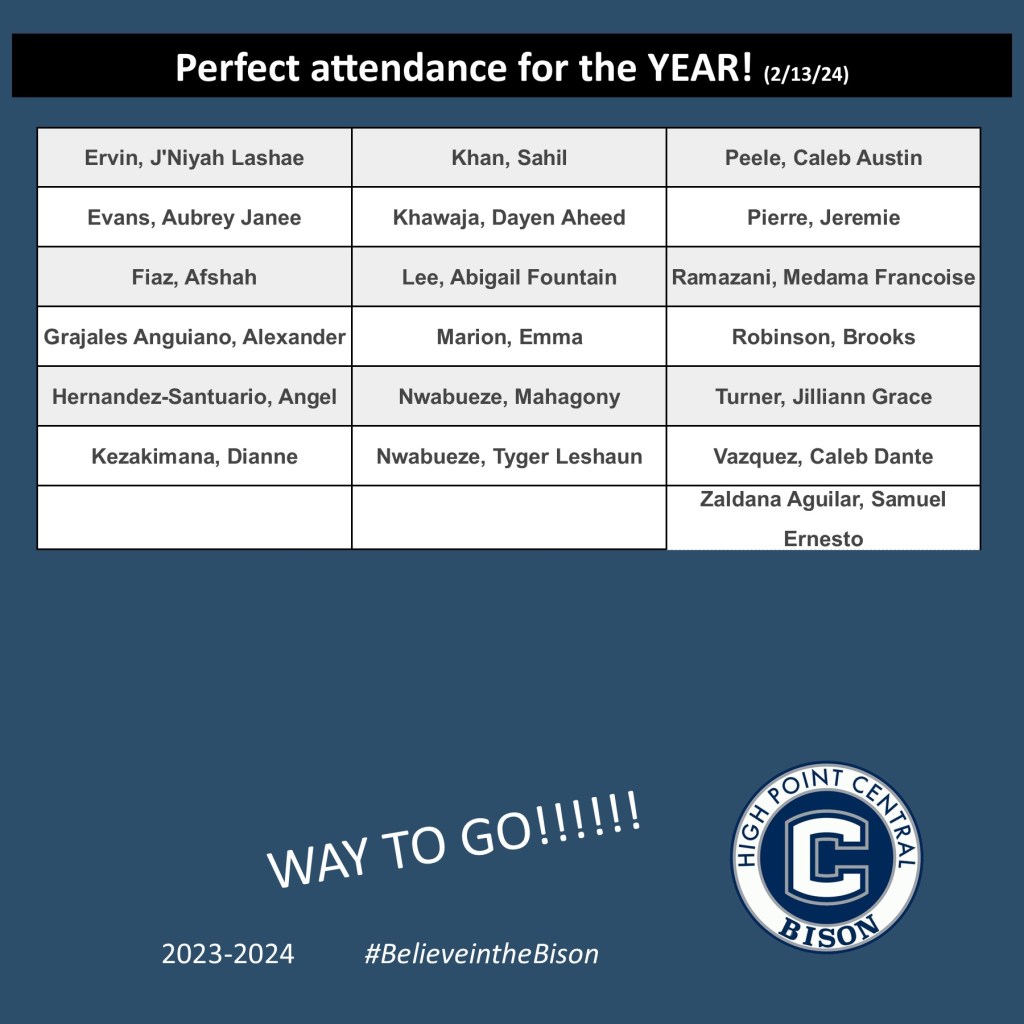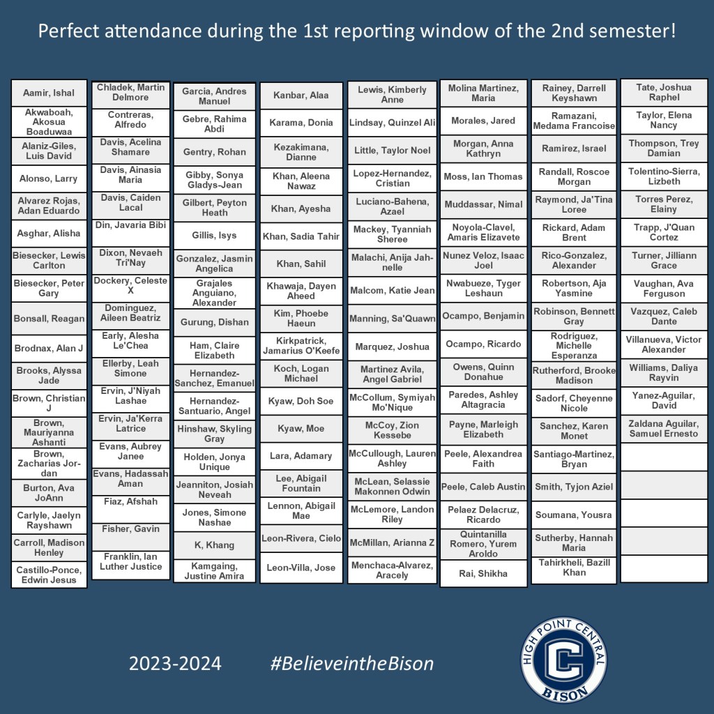Congratulations to the students who are achieving perfect attendance for the year, as well as those who have been in perfect attendance for the 2nd semester, 1st reporting window.
