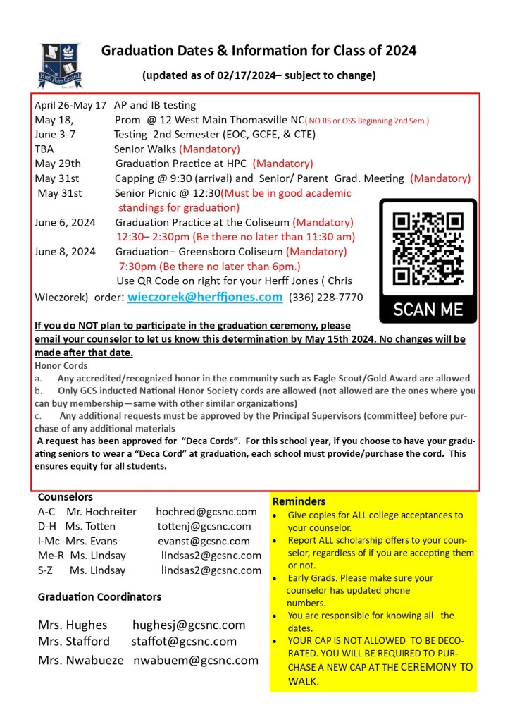 12:30-2:30 – Graduation Practice – Greensboro Coliseum (be at Coliseum no later than 11:30)