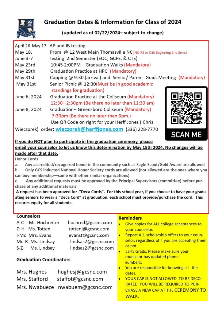 12:30-2:30 – Graduation Practice – Greensboro Coliseum (be at Coliseum no later than 11:30)