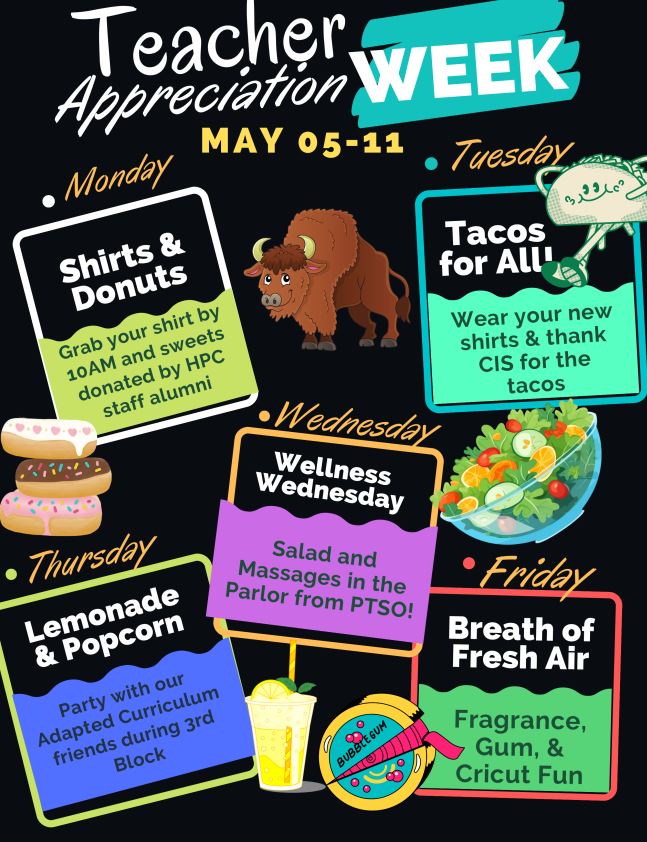 This week is Teachers Appreciation Week. Please help us celebrate everything our staff does on a daily basis. Feel free to send them a card, e-mail, or anything you wish to show your appreciation. If you wish to help on a much greater level next year, please do not hesitate to reach out.