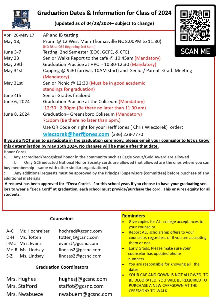 12:30-2:30 – Graduation Practice – Greensboro Coliseum (be at Coliseum no later than 11:30)