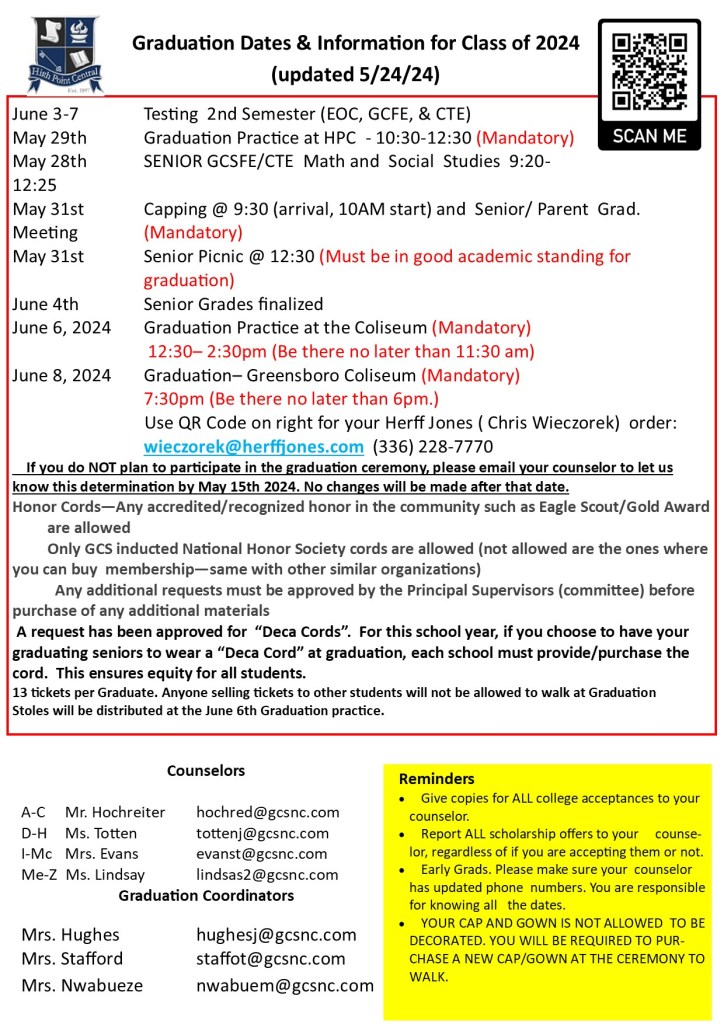 12:30-2:30 – Graduation Practice – Greensboro Coliseum (be at Coliseum no later than 11:30)