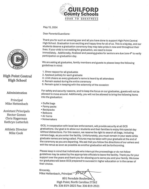 12:30-2:30 – Graduation Practice – Greensboro Coliseum (be at Coliseum no later than 11:30)