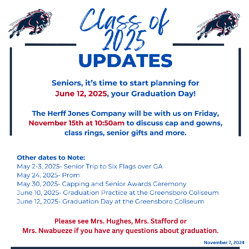 Seniors and early graduates, it’s time to start preparing for your big day, Graduation! We will have the Herff Jones company at HPC on November 15th at 10:50am in the auditorium. Please plan to attend. There will be some valuable information shared about purchasing your cap and gown, ordering invitations and more! See Mrs. Hughes, Mrs. Stafford in the Main Office or Mrs. Nwabueze if you have questions about graduation.