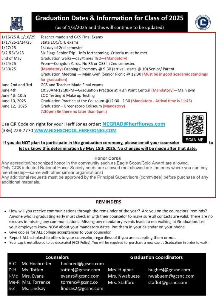 Seniors and early grads, please make every effort to put some money down for your cap and gown, as Herff Jones will increase their prices as we navigate through the year. Please remember to put all graduation timeline dates into your calendar, and start talking to your employers now to make sure you are off from any other obligations. See Mrs. Hughes, Mrs. Stafford in the Main Office or Mrs. Nwabueze if you have questions about graduation.