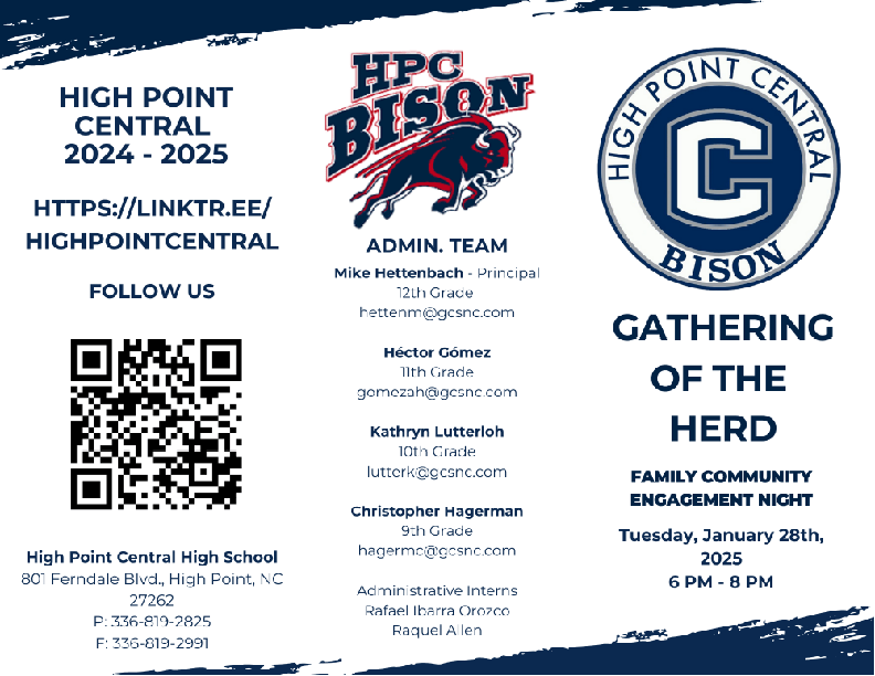 I hope you have heard the amazing news! High Point Central was named the prestigious Hubert Humphrey Most Improved School at the state of the county banquet. This is a testament to the passion and perseverance of our amazing staff, the students that work hard, use resources in front of them and set high goals. The parents and guardians who advocate for their student while also supporting the school, and of course our powerful alumni and community members! If you have not seen the news segment, simply go to google and type in High Point Central Hubert Humphrey award. WFMY did a great job!