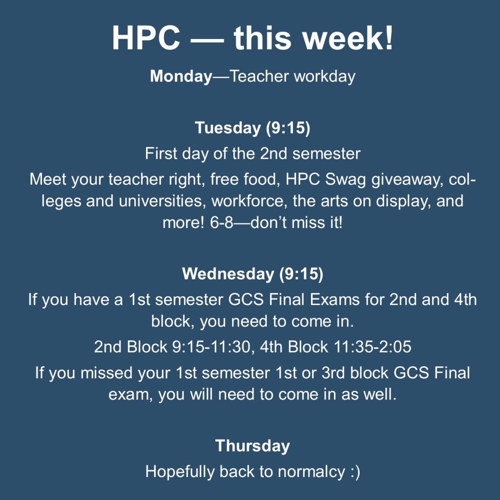 This coming week is a big week, not only with the start of the semester and the big family evening, but we must finish the FIRST semester’s GCS Final Exams on Wednesday. Therefore, Wednesday is ONLY for the 1st semester’s 2nd and 4th block missed GCS Final Exams and anyone who has missed the 1st and 3rd block GCSFEs from the first semester. On Thursday, it is my hope we can get back to normalcy with school. Thank you so much for your patience with testing and with Mother Nature.