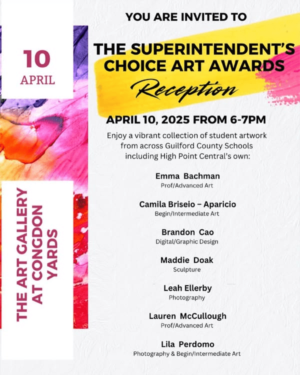 We are thrilled to share that High Point Central will be shining brightly in this year’s Superintendent’s Choice Art Awards Exhibition—the annual county-wide showcase for Guilford County Schools! This is a wonderful opportunity to see the outstanding creations of our student artists in both my classes and Ms. Ballard’s classes.