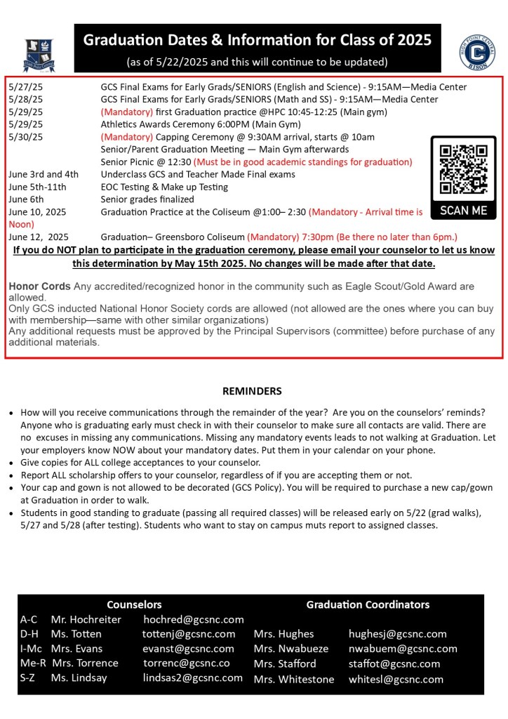 Early grad and graduates begin their testing Tuesday. English and science is given on Tuesday, in the Media Center, while SS and Math are given on Wednesday. Early grads and grads will then report to the main gym for our first graduation practice on Thursday. The practice is mandatory and starts at 10:45 and ends at 12:25. As shared many times prior to, these practices have been shared long in advance for the purpose of discussing this with your employer.