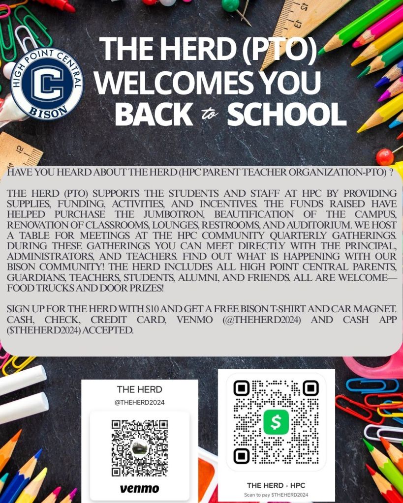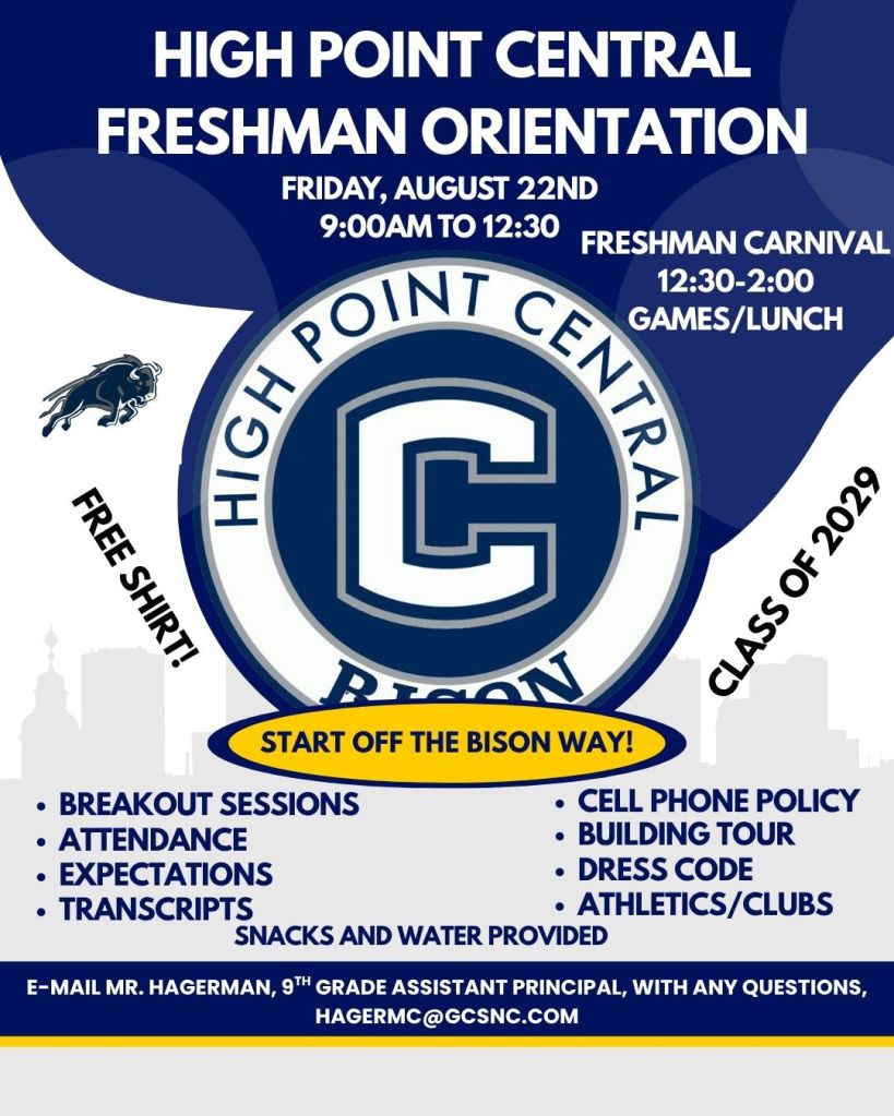 Good evening! This is Principal Hettenbach from High Point Central High School with a message from the Boulevard. How exciting, we are only one week away before students return to the campus. This week is open house on Tuesday from 5:30-7:30. Students, if you wish to pick up your most recent schedule, please come to the school during this time. Seniors have a meeting from 6-7 in the Auditorium. Open House is an opportunity to talk to your counselor, meet your teachers, get your parking passes, and more!! Freshmen Orientation is Friday, and all staff return to the building this week. The first day of school starts on Monday, August 25th. The school day runs from 9:15 to 4:15. Students should arrive no later than 9:10 in order to get to class on time and not be marked tardy. As a reminder, if you are new to our school, we send an all call message in English every Sunday during the school year at 6:30, followed by Spanish at 7:00. If you do not want to listen to one of the two messages, a simple hang up will be sufficient. These messages will also be sent to your cell phone as a text link as well as to your e-mail address you may have on file. If you do not receive these messages on those platforms but wish to do so, please let us know. Please do not hesitate to reach out to the school for any reason. Please continue to enjoy your summer, and always remember if you are ever facing adversity, just be like the Bison, #ChargetheStorm!