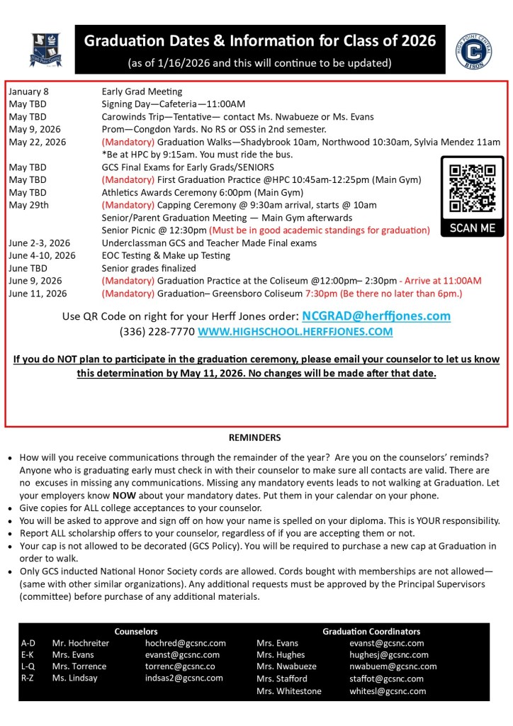 Seniors and Early Grads should have ordered their caps and gowns. Please contact the front office at school with any questions if you have not and are unsure what to do.