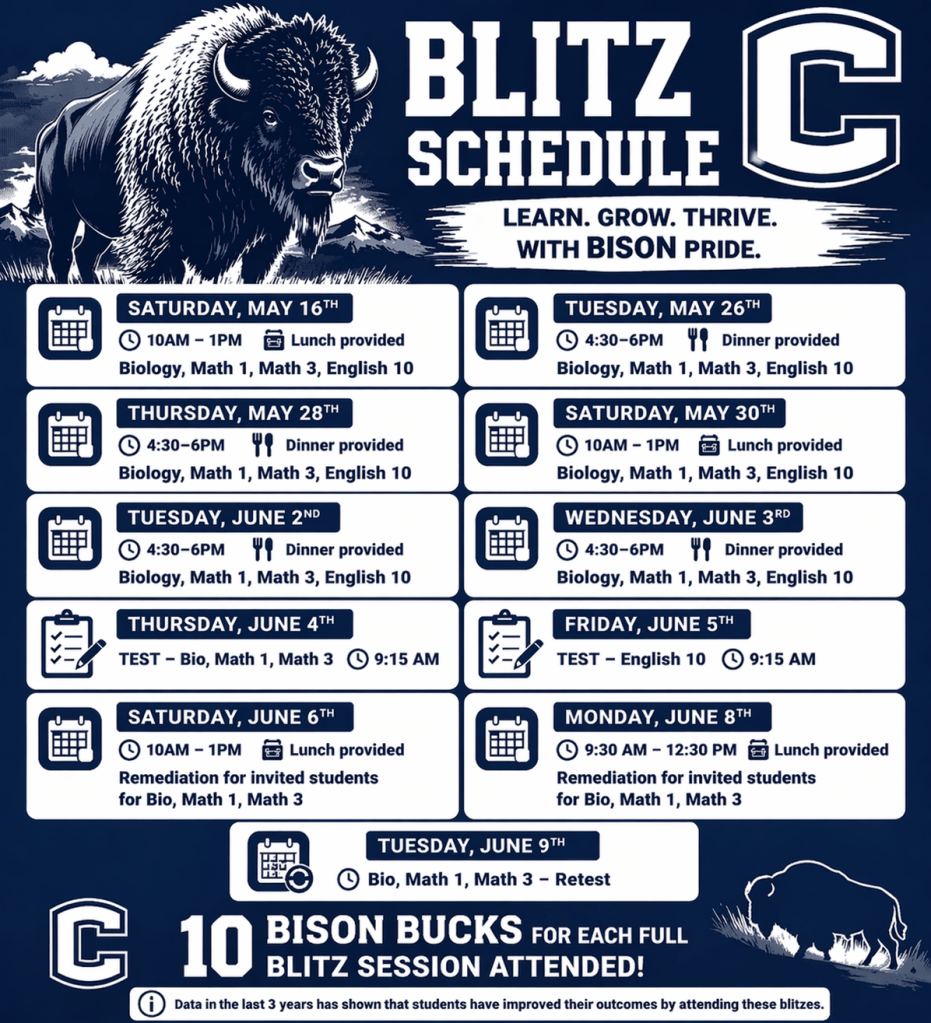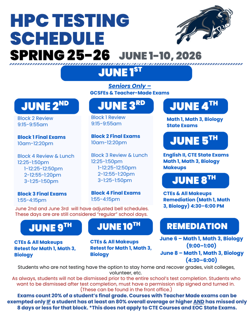 As we are now into the 4th quarter, you will find the testing schedule along with State testing tutorials offered in Biology, Math 1 Math 3, English 10. These sessions have shown dramatic growth for any students who have attended these sessions. Students enrolled in these classes should not miss opportunity.