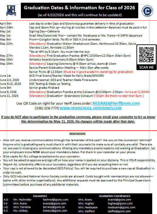 Seniors and Early Grads should have ordered their caps and gowns. Prices go up another $10 on March 1st. Please contact the front office at school with any questions if you have not and are unsure what to do.